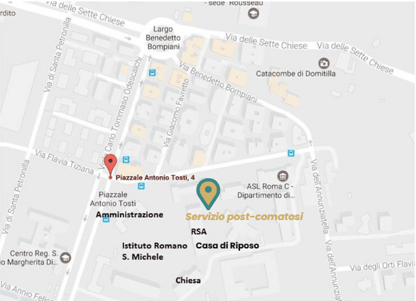Il servizio post-comatosi si trova al terzo piano lato A della Palazzina Toti, all’interno del comprensorio istituzionale dell’ASP Istituto Romano di San Michele, sito in Piazzale Antonio Tosti 4, nel quartiere Ardeatino, quadrante sud-est della città di Roma, ben collegato in direzione del Centro storico e dell’Appia Antica.